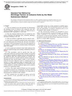 ASTM D4943-18 is a standard published by ASTM International. Its full title is "Standard Test Method for Shrinkage Factors of Cohesive Soils by the Water Submersion Method". This standard covers: SIGNIFICANCE AND USE 5.1 The shrinkage limit can be used to evaluate the shrinkage potential, crack development potential, and swell potential of earthwork involving cohesive soils. 5.2 The shrinkage limit, along with the liquid limit and plastic limit of soil, are often collectively referred to as the Atterberg limits in recognition of their formation by Swedish soil scientist, A. Atterberg. These limits distinguish the boundaries of the several consistency states of cohesive soils. Note 1: The quality of the result produced by this standard is dependent on the competence of the personnel performing it, and the suitability of the equipment and facilities used. Agencies that meet the criteria of Practice D3740 are generally considered capable of competent and objective testing/sampling/inspection/and the like. Users of this standard are cautioned that compliance with Practice D3740 does not in itself assure reliable results. Reliable results depend on many factors; Practice D3740 provides a means of evaluating some of those factors. SCOPE 1.1 This test method covers the procedure for determining the shrinkage factors of cohesive soils, using the water submersion technique, whereby the volume of a dried soil pat is determined while suspended in a water bath. 1.2 The data obtained following this test method are also used to determine the shrinkage ratio, volumetric shrinkage, and linear shrinkage of the soil. 1.3 This test method is applicable only for cohesive soils. 1.4 Since this test method is performed only on that portion of a soil which passes the 425-μm (No. 40) sieve, the relative consistency of the tested portion of the soil to the properties of the sample as a whole must be considered when evaluating the entire soil sample. 1.5 All recorded and calculated values shall conform to the guide for significant digits and rounding established in Practice D6026. 1.5.1 The procedures, used to specify how data are collected/recorded and calculated in this standard, are regarded as the industry standard. In addition, they are representative of the significant digits that should generally be retained. The procedures used do not consider material variation, purpose for obtaining the data, special purpose studies, or any considerations for the user’s objectives; and it is common practice to increase or reduce significant digits of reported data to be commensurate with these considerations. It is beyond the scope of this standard to consider significant digits used in analysis methods for engineering design. 1.6 Units—The values stated in SI units are to be regarded as standard except the sieve designations are shown using the alternative sieve designation in parentheses. No other units of measurement are included in this standard. 1.7 This standard does not purport to address all of the safety concerns, if any, associated with its use. It is the responsibility of the user of this standard to establish appropriate safety, health, and environmental practices and determine the applicability of regulatory limitations prior to use. For specific safety hazards, see Section 8. 1.8 This international standard was developed in accordance with internationally recognized principles on standardization established in the Decision on Principles for the Development of International Standards, Guides and Recommendations issued by the World Trade Organization Technical Barriers to Trade (TBT) Committee.