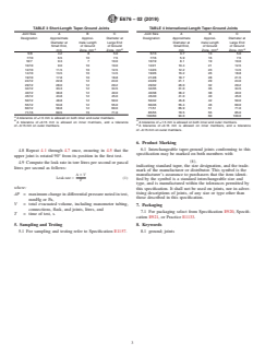 ASTM E676-02(2019) is a technical specification published by ASTM International. Its full title is "Standard Specification for Interchangeable Taper-Ground Joints". This standard covers: ABSTRACT This specification covers the required properties of only the ground surfaces of interchangeable taper-ground joints used in laboratory and industrial equipment in full-length, medium length, short length, and international length grindings. It includes information on the testing method for the products. After testing, samples should conform to the required quality of surface finish, taper, and leakage for the specific joint size designation. SCOPE 1.1 This specification covers designations, dimensions, and tolerances for only the ground surfaces of interchangeable taper-ground joints for laboratory and industrial equipment in full-length, medium-length, short-length, and international-length (ISO K-6 series) grindings. Note 1: The dimensions pertaining to full-length, medium-length, and short-length joints, other than for the tolerance on length of grind, were taken directly from the now obsolete Commercial Standard CS 21. Note 2: Tolerances on the diameters of the international-length joints do not agree with those given in ISO Recommendation R 383. These tolerances have been established to agree with those of CS 21 in order to prevent the negative projection (large end of inner joint being smaller than large end of outer joint) permitted by ISO. Note 3: Although glass is the most commonly used material for ground joints, other materials may be used as specified. Taper-ground joints constructed from glass should be of suitable chemical and thermal properties in accordance with Specification E438. Joints should be as free as possible of visible defects and conform to Specification E671. 1.2 The following precautionary caveat pertains only to the Test Method portion, Section 4, of this specification. This standard does not purport to address all of the safety concerns, if any, associated with its use. It is the responsibility of the user of this standard to establish appropriate safety, health, and environmental practices and determine the applicability of regulatory limitations prior to use. 1.3 This international standard was developed in accordance with internationally recognized principles on standardization established in the Decision on Principles for the Development of International Standards, Guides and Recommendations issued by the World Trade Organization Technical Barriers to Trade (TBT) Committee.