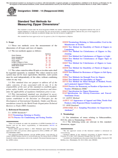 ASTM D2060-14(2022), titled Standard Test Methods for Measuring Zipper Dimensions, provides standardized methods for determining the physical dimensions of all types and sizes of zippers. Developed by ASTM International, this standard is widely used in the textile and apparel industries to ensure consistent quality and dimensional compliance of zippers used in commercial products. The test methods are designed to be practical for acceptance testing of commercial shipments and are recognized for their reliability throughout the global trade of textiles.