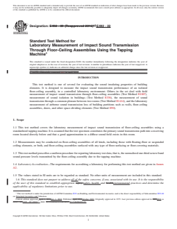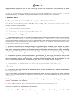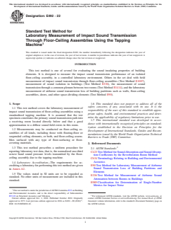 SIGNIFICANCE AND USE 5.1 The spectrum of the noise in the room below the test specimen is determined by the following: 5.1.1 The size and the mechanical properties of the floor-ceiling assembly, such as its construction, surface, mounting or edge restraints, stiffness, or internal damping, 5.1.2 The acoustical response of the room below, 5.1.3 The placement of the object or device producing the impacts, and 5.1.4 The nature of the actual impact itself. 5.2 This test method is based on the use of a standardized tapping machine of the type specified in 8.1 placed in specific positions on the floor. This machine produces a continuous series of uniform impacts at a uniform rate on a test floor and generates in the receiving room broadband sound pressure levels that are sufficiently high to make measurements possible beneath most floor types even in the presence of background noise. The tapping machine itself, however, is not designed to simulate any one type of impact, such as produced by male or female footsteps. 5.3 Because of its portable design, the tapping machine does not simulate the weight of a human walker. Therefore, the structural sounds, i.e., creaks or booms of a floor assembly caused by such footstep excitation is not reflected in the single number impact rating derived from test results obtained by this test method. The degree of correlation between the results of tapping machine tests in the laboratory and the subjective acceptance of floors under typical conditions of domestic impact excitation is uncertain. The correlation will depend on both the type of floor construction and the nature of the impact excitation in the building. 5.4 In laboratories designed to satisfy the requirements of this test method, the intent is that only significant path for sound transmission between the rooms is through the test specimen. This is not generally the case in buildings where there are often many other paths for sounds— flanking sound transmission. Consequently so... SCOPE 1.1 This test method covers the laboratory measurement of impact sound transmission of floor-ceiling assemblies using a standardized tapping machine. It is assumed that the test specimen constitutes the primary sound transmission path into a receiving room located directly below and that a good approximation to a diffuse sound field exists in this room. 1.2 Measurements may be conducted on floor-ceiling assemblies of all kinds, including those with floating-floor or suspended ceiling elements, or both, and floor-ceiling assemblies surfaced with any type of floor-surfacing or floor-covering materials. 1.3 This test method prescribes a uniform procedure for reporting laboratory test data, that is, the normalized one-third octave band sound pressure levels transmitted by the floor-ceiling assembly due to the tapping machine. 1.4 Laboratory Accreditation—The requirements for accrediting a laboratory for performing this test method are given in Annex A2. 1.5 The values stated in SI units are to be regarded as standard. No other units of measurement are included in this standard. 1.6 This standard does not purport to address all of the safety concerns, if any, associated with its use. It is the responsibility of the user of this standard to establish appropriate safety, health, and environmental practices and determine the applicability of regulatory limitations prior to use. 1.7 This international standard was developed in accordance with internationally recognized principles on standardization established in the Decision on Principles for the Development of International Standards, Guides and Recommendations issued by the World Trade Organization Technical Barriers to Trade (TBT) Committee.