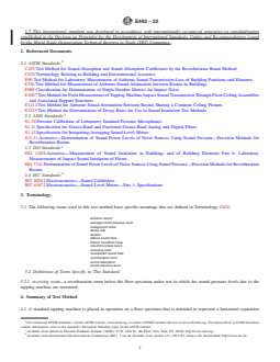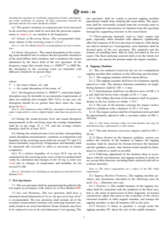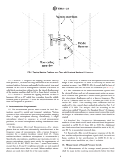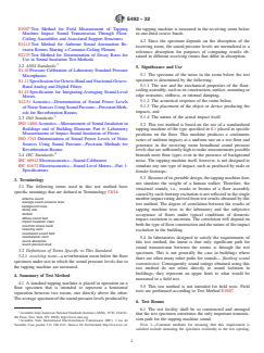 ASTM E492-22 is a standard published by ASTM International. Its full title is "Standard Test Method for Laboratory Measurement of Impact Sound Transmission Through Floor-Ceiling Assemblies Using the Tapping Machine". This standard covers: SIGNIFICANCE AND USE 5.1 The spectrum of the noise in the room below the test specimen is determined by the following: 5.1.1 The size and the mechanical properties of the floor-ceiling assembly, such as its construction, surface, mounting or edge restraints, stiffness, or internal damping, 5.1.2 The acoustical response of the room below, 5.1.3 The placement of the object or device producing the impacts, and 5.1.4 The nature of the actual impact itself. 5.2 This test method is based on the use of a standardized tapping machine of the type specified in 8.1 placed in specific positions on the floor. This machine produces a continuous series of uniform impacts at a uniform rate on a test floor and generates in the receiving room broadband sound pressure levels that are sufficiently high to make measurements possible beneath most floor types even in the presence of background noise. The tapping machine itself, however, is not designed to simulate any one type of impact, such as produced by male or female footsteps. 5.3 Because of its portable design, the tapping machine does not simulate the weight of a human walker. Therefore, the structural sounds, i.e., creaks or booms of a floor assembly caused by such footstep excitation is not reflected in the single number impact rating derived from test results obtained by this test method. The degree of correlation between the results of tapping machine tests in the laboratory and the subjective acceptance of floors under typical conditions of domestic impact excitation is uncertain. The correlation will depend on both the type of floor construction and the nature of the impact excitation in the building. 5.4 In laboratories designed to satisfy the requirements of this test method, the intent is that only significant path for sound transmission between the rooms is through the test specimen. This is not generally the case in buildings where there are often many other paths for sounds— flanking sound transmission. Consequently so... SCOPE 1.1 This test method covers the laboratory measurement of impact sound transmission of floor-ceiling assemblies using a standardized tapping machine. It is assumed that the test specimen constitutes the primary sound transmission path into a receiving room located directly below and that a good approximation to a diffuse sound field exists in this room. 1.2 Measurements may be conducted on floor-ceiling assemblies of all kinds, including those with floating-floor or suspended ceiling elements, or both, and floor-ceiling assemblies surfaced with any type of floor-surfacing or floor-covering materials. 1.3 This test method prescribes a uniform procedure for reporting laboratory test data, that is, the normalized one-third octave band sound pressure levels transmitted by the floor-ceiling assembly due to the tapping machine. 1.4 Laboratory Accreditation—The requirements for accrediting a laboratory for performing this test method are given in Annex A2. 1.5 The values stated in SI units are to be regarded as standard. No other units of measurement are included in this standard. 1.6 This standard does not purport to address all of the safety concerns, if any, associated with its use. It is the responsibility of the user of this standard to establish appropriate safety, health, and environmental practices and determine the applicability of regulatory limitations prior to use. 1.7 This international standard was developed in accordance with internationally recognized principles on standardization established in the Decision on Principles for the Development of International Standards, Guides and Recommendations issued by the World Trade Organization Technical Barriers to Trade (TBT) Committee.