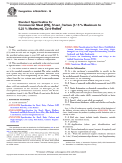 ASTM A794/A794M-18 is a technical specification published by ASTM International. Its full title is "Standard Specification for Commercial Steel (CS), Sheet, Carbon (0.16 % Maximum to 0.25 % Maximum), Cold-Rolled". This standard covers: ABSTRACT This specification covers standard requirements for cold-rolled commercial steel sheet coils and cut lengths. The cast or heat analysis of the steel shall conform to the chemical requirements for carbon, manganese, phosphorus, and sulfur. Unspecified elements may be present. Limits on additional elements such as copper, nickel, chromium, molybdenum, vanadium, and columbium shall be stated. The material shall also conform to the required bending properties. SCOPE 1.1 This specification covers cold-rolled commercial steel (CS) sheet in coils and cut lengths, in which the maximum of the specified carbon range is over 0.15 and not over 0.25 %, and the maximum of the specified manganese range is not over 0.90 %. This material is ordered to chemical composition. 1.2 This specification is not applicable to the steels covered in Specifications A109/A109M and A1008/A1008M. 1.3 The values stated in either SI units or inch-pound units are to be regarded separately as standard. The values stated in each system may not be exact equivalents; therefore, each system shall be used independently of the other. Combining values from the two systems may result in non-conformance with the standard. 1.4 This international standard was developed in accordance with internationally recognized principles on standardization established in the Decision on Principles for the Development of International Standards, Guides and Recommendations issued by the World Trade Organization Technical Barriers to Trade (TBT) Committee.