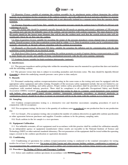 ASTM D5807-18 is a standard published by ASTM International. Its full title is "Standard Practice for Evaluating the Overpressurization Characteristics of Inflatable Restraint Cushions". This standard covers: SIGNIFICANCE AND USE 5.1 This practice is intended to be a general guideline for repetitive testing, safe conduct of tests, and accurate data collection for inflatable restraints. Cushion overpressurization testing may be used for design and production validation, for manufacturing process control, for lot acceptance, or for a combination thereof. 5.2 This practice constitutes the conditions, apparatus, and procedures by which inflatable restraints are commonly tested for cushion overpressurization. It is intended to be used as a guideline in establishing a cushion specification or equivalent document. The practices in the specification may deviate from the practices described herein when (based on experience) considerations of equipment, cushion design, or other factors dictate otherwise. 5.3 There exists a large variety in cushion configurations and equipment designs, obviating a standard test method for cushion overpressurization. Therefore, a cushion specification should incorporate the practices stated herein when describing a test method for testing a specific cushion geometry and apparatus design. To ensure accuracy and repeatability, the specification should also address precision and bias in a manner consistent with ASTM prescribed procedures and consistent with the particular cushion geometry, equipment in use, and test procedures. 5.3.1 Sources of variation in cushion overpressurization testing procedures include orifice size, attachment fixture, sensor location, method of attachment, presence or absence of internal bladder, accumulator size and pressure, transducer type and location, the presence or absence of tethers, presence or absence of vent plugs, and the accuracy of timing devices and pressure sensors. All sources of equipment and procedural variation should be addressed in the applicable specification. 5.4 In accordance with the applicable specification, cushions may be pressurized without bursting to determine their resistance to a fixed level of high in... SCOPE 1.1 This practice covers the procedures and conditions used to evaluate the physical performance of inflatable restraint cushions during and after overpressurization testing at elevated pressures capable of causing cushion bursting using air pressurization equipment. 1.2 The physical performance characteristics that may be obtained in conjunction with this practice are internal cushion pressures determined by instrumentation and material integrity, determined by visual inspection. 1.3 This practice is applicable to all inflatable restraint cushions. 1.4 Procedures and apparatus other than those stated in this practice may be used by agreement between purchaser and supplier with the specific deviations from this practice acknowledged in the report. 1.5 The values stated in either SI units or inch-pound units are to be regarded separately as standard. The values stated in each system are not exact equivalents; therefore, each system must be used independently of the other. 1.6 This standard does not purport to address all of the safety concerns, if any, associated with its use. It is the responsibility of the user of this standard to establish appropriate safety, health, and environmental practices and determine the applicability of regulatory limitations prior to use. 1.7 This international standard was developed in accordance with internationally recognized principles on standardization established in the Decision on Principles for the Development of International Standards, Guides and Recommendations issued by the World Trade Organization Technical Barriers to Trade (TBT) Committee.