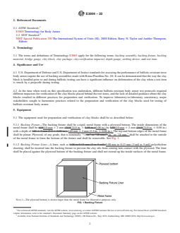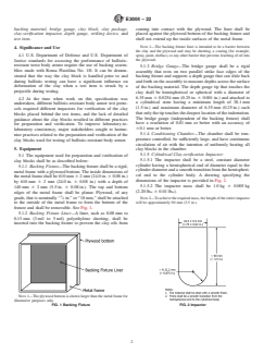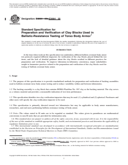 ABSTRACT This specification describes a standardized method for preparation and verification of backing assemblies used in ballistic-resistant torso body armor testing and for reducing variability within and between laboratories. Included in this specification are the equipment used for preparation and verification of clay blocks, namely: backing fixture, backing fixture liner, bridge gauge, conditioning chamber, impactor, striking device, template, test setup, and velocity measurement equipment. This specification also covers procedures for characterization of clay block verification test setup, clay block preparation, clay block verification procedure prior to ballistic testing, clay block repair, clay block verification between test items, and clay block verification after final shot on clay block. SCOPE 1.1 The purpose of this specification is to provide standardized methods for preparation and verification of backing assemblies used in ballistic-resistant torso body armor testing and to reduce variability within and between laboratories. 1.2 The backing assembly is a clay block that contains ROMA Plastilina No. 1®2 clay as the backing material. The clay serves as a witness material and provides a measurable indication of test item performance. 1.3 This specification identifies two clay-verification impactors that may be used: (1) cylindrical and (2) spherical. Purchasers and other users will specify the clay-verification impactor to be used. 1.4 This specification is primarily directed toward test laboratories but may be applicable to body armor manufacturers, researchers, and end users performing ballistic-resistance testing of body armor. 1.5 Units—The values stated in SI units are to be regarded as standard. The values given in parentheses are mathematical conversions to non-SI units that are provided for information only. 1.6 This standard does not purport to address all of the safety concerns, if any, associated with its use. It is the responsibility of the user of this standard to establish appropriate safety, health, and environmental practices and determine the applicability of regulatory limitations prior to use. 1.7 This international standard was developed in accordance with internationally recognized principles on standardization established in the Decision on Principles for the Development of International Standards, Guides and Recommendations issued by the World Trade Organization Technical Barriers to Trade (TBT) Committee.
