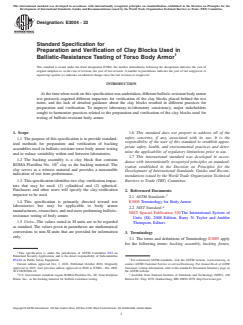 ASTM E3004-22 is a technical specification published by ASTM International. Its full title is "Standard Specification for Preparation and Verification of Clay Blocks Used in Ballistic-Resistance Testing of Torso Body Armor". This standard covers: ABSTRACT This specification describes a standardized method for preparation and verification of backing assemblies used in ballistic-resistant torso body armor testing and for reducing variability within and between laboratories. Included in this specification are the equipment used for preparation and verification of clay blocks, namely: backing fixture, backing fixture liner, bridge gauge, conditioning chamber, impactor, striking device, template, test setup, and velocity measurement equipment. This specification also covers procedures for characterization of clay block verification test setup, clay block preparation, clay block verification procedure prior to ballistic testing, clay block repair, clay block verification between test items, and clay block verification after final shot on clay block. SCOPE 1.1 The purpose of this specification is to provide standardized methods for preparation and verification of backing assemblies used in ballistic-resistant torso body armor testing and to reduce variability within and between laboratories. 1.2 The backing assembly is a clay block that contains ROMA Plastilina No. 1®2 clay as the backing material. The clay serves as a witness material and provides a measurable indication of test item performance. 1.3 This specification identifies two clay-verification impactors that may be used: (1) cylindrical and (2) spherical. Purchasers and other users will specify the clay-verification impactor to be used. 1.4 This specification is primarily directed toward test laboratories but may be applicable to body armor manufacturers, researchers, and end users performing ballistic-resistance testing of body armor. 1.5 Units—The values stated in SI units are to be regarded as standard. The values given in parentheses are mathematical conversions to non-SI units that are provided for information only. 1.6 This standard does not purport to address all of the safety concerns, if any, associated with its use. It is the responsibility of the user of this standard to establish appropriate safety, health, and environmental practices and determine the applicability of regulatory limitations prior to use. 1.7 This international standard was developed in accordance with internationally recognized principles on standardization established in the Decision on Principles for the Development of International Standards, Guides and Recommendations issued by the World Trade Organization Technical Barriers to Trade (TBT) Committee.