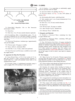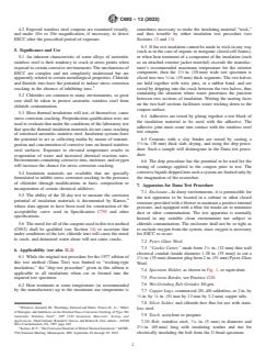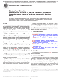 SIGNIFICANCE AND USE 5.1 An inherent characteristic of some alloys of austenitic stainless steel is their tendency to crack at stress points when exposed to certain corrosive environments. The mechanisms of ESCC are complex and not completely understood but are apparently related to certain metallurgical properties. Chloride and fluoride ions have the potential to induce stress corrosion cracking in the absence of inhibiting ions.3 5.2 Chlorides are common to many environments, so great care shall be taken to protect austenitic stainless steel from chloride contamination. 5.3 Most thermal insulations will not, of themselves, cause stress corrosion cracking. Preproduction qualification tests are used to evaluate that under the conditions of the laboratory test that specific thermal insulation materials do not cause cracking of sensitized austenitic stainless steel. Insulation systems have the potential to act as collecting media by means of transmigration and concentration of corrosive ions on heated stainless steel surfaces. Exposure to elevated temperature results in evaporation of water and increased chemical reaction rates. Environments containing corrosive ions, moisture, and oxygen will increase the chance for stress corrosion cracking. 5.4 Insulation materials are available that are specially formulated to inhibit stress corrosion cracking in the presence of chlorides through modifications in basic composition or incorporation of certain chemical additives. 5.5 The ability of the 28-day test to measure the corrosion potential of insulation materials is documented by Karnes,4 whose data appear to have been used for construction of the acceptability curve used in Specification C795 and other specifications. 5.6 The metal for all of the coupons used in this test method (C692) shall be qualified (see Section 14) to ascertain that under conditions of the test, chloride ions will cause the metal to crack, and deionized water alone will not cause cracks. SCOPE 1.1 This test method covers two procedures for the laboratory evaluation of thermal insulation materials to determine whether they contribute to external stress corrosion cracking (ESCC) of austenitic stainless steel due to soluble chlorides within the insulation. This laboratory procedure is not intended to cover all of the possible field conditions that contribute to ESCC. 1.2 While the 1977 edition of this test method (Dana test) is applicable only to wicking-type insulations, the procedures in this edition are intended to be applicable to all insulating materials, including cements, some of which disintegrate when tested in accordance with the 1977 edition. Wicking insulations are materials that wet through and through when partially (50 % to 75 %) immersed in water for a short period of time (10 min or less). 1.3 These procedures are intended primarily as a preproduction test for qualification of the basic chemical composition of a particular manufacturer's product and are not intended to be routine tests for ongoing quality assurance or production lot compliance. Test Methods C871, on the other hand, is used for confirmation of acceptable chemical properties of subsequent lots of insulation previously found acceptable by this test method. 1.4 The values stated in inch-pound units are to be regarded as standard. The values given in parentheses are mathematical conversions to SI units that are provided for information only and are not considered standard. 1.5 This standard does not purport to address all of the safety concerns, if any, associated with its use. It is the responsibility of the user of this standard to establish appropriate safety, health, and environmental practices and determine the applicability of regulatory limitations prior to use. 1.6 This international standard was developed in accordance with internationally recognized principles on standardization established in the Decision on Principles for the Dev...