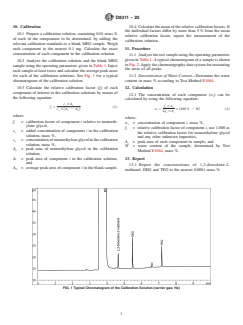 SIGNIFICANCE AND USE 4.1 This test method is suitable for setting specifications and for use as an internal quality control tool where these products are produced or are used. Typical impurities are: 1,3-dioxolane-2-methanol, diethylene glycol, and triethylene glycol. 4.2 This method may not detect all components and there may be unknown components that would be assigned inappropriate relative calibration factors and thus, the results may not be absolute. SCOPE 1.1 This test method covers the gas chromatographic determination of impurities in monoethylene glycol including 1,3-dioxolane-2-methanol, diethylene glycol (DEG) and triethylene glycol (TEG). The purity of monoethylene glycol (MEG) is also calculated. A similar test method, using the internal standard calibration technique and the external standard calibration technique, is Test Method E2409. 1.2 This test method is applicable for monoethylene glycol purities of 98.0 mass % or higher. 1.3 The limit of detection (LOD) for 1,3-dioxolane-2-methanol, DEG and TEG is 0.0002 mass %. 1.4 In determining the conformance of the test results using this method to applicable specifications, results shall be rounded off in accordance with the rounding-off method of Practice E29. 1.5 The values stated in SI units are to be regarded as standard. No other units of measurement are included in this standard. 1.6 This standard does not purport to address all of the safety concerns, if any, associated with its use. It is the responsibility of the user of this standard to establish appropriate safety, health, and environmental practices and determine the applicability of regulatory limitations prior to use. 1.7 This international standard was developed in accordance with internationally recognized principles on standardization established in the Decision on Principles for the Development of International Standards, Guides and Recommendations issued by the World Trade Organization Technical Barriers to Trade (TBT) Committee.
