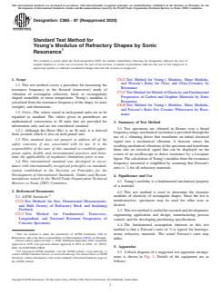 SIGNIFICANCE AND USE 4.1 Young’s modulus is a fundamental mechanical property of a material. 4.2 This test method is used to determine the dynamic modulus of elasticity of rectangular shapes. Since the test is nondestructive, specimens may be used for other tests as desired. 4.3 This test method is useful for research and development, engineering application and design, manufacturing process control, and for developing purchasing specifications. 4.4 The fundamental assumption inherent in this test method is that a Poisson’s ratio of 1/6 is typical for heterogeneous refractory materials. The actual Poisson's ratio may differ. SCOPE 1.1 This test method covers a procedure for measuring the resonance frequency in the flexural (transverse) mode of vibration of rectangular refractory brick or rectangularly shaped monoliths at room temperature. Young's modulus is calculated from the resonance frequency of the shape, its mass (weight), and dimensions. 1.2 Units—The values stated in inch-pound units are to be regarded as standard. The values given in parentheses are mathematical conversions to SI units that are provided for information only and are not considered standard. 1.2.1 Although the Hertz (Hz) is an SI unit, it is derived from seconds which is also an inch-pound unit. 1.3 This standard does not purport to address all of the safety concerns, if any, associated with its use. It is the responsibility of the user of this standard to establish appropriate safety, health, and environmental practices and determine the applicability of regulatory limitations prior to use. 1.4 This international standard was developed in accordance with internationally recognized principles on standardization established in the Decision on Principles for the Development of International Standards, Guides and Recommendations issued by the World Trade Organization Technical Barriers to Trade (TBT) Committee.