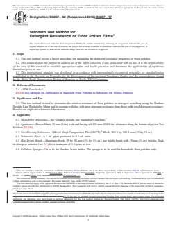 • Test Methods: The standard provides step-by-step guidance for preparing test surfaces, applying floor finish, conducting detergent resistance tests, and rating results based on visible deterioration of the polish film.