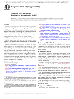 ASTM D6677-18(2022) is a standard published by ASTM International. Its full title is "Standard Test Method for Evaluating Adhesion by Knife". This standard covers: SIGNIFICANCE AND USE 4.1 Coatings, to perform satisfactorily, must adhere to the substrates on which they are applied. This test method has been found useful as a simple means of assessing the adhesion of coatings. Although this method is a qualitative (subjective) test it has been used in industry for many years and can provide valuable information. 4.2 Other adhesion test methods may be useful in obtaining quantitative results. See Test Methods D2197, D3359, D4541, and D7234. 4.3 The Performance Evaluation Scale (see Table 1) is based on both the degree of difficulty to remove the coating from the substrate and the size of removed coating chip. 4.4 This test method does not have a known correlation to other adhesion test methods (pull-off, tape, etc.). 4.5 A coating that has a high degree of cohesive strength may appear to have worse adhesion than one that is brittle and hence fractures easily when probed. 4.6 This method is not to be used on overly thick coatings, that is, those which cannot be cut to the substrate with a utility knife in one stroke. SCOPE 1.1 This test method covers the procedure for assessing the adhesion of coating films to substrate by using a knife. 1.2 This test method is used to establish whether the adhesion of a coating to a substrate or to another coating (in multi-coat systems) is at a generally adequate level. Note 1: The term “substrate” relates to the basic surface on which a coating adheres (may be steel, concrete, etc. or other coating). 1.3 This method can be used in the laboratory and field. 1.4 The values stated in SI units are to be regarded as the standard. The values given in parentheses are for information only. 1.5 This standard does not purport to address all of the safety concerns, if any, associated with its use. It is the responsibility of the user of this standard to establish appropriate safety, health, and environmental practices and determine the applicability of regulatory limitations prior to use. 1.6 This international standard was developed in accordance with internationally recognized principles on standardization established in the Decision on Principles for the Development of International Standards, Guides and Recommendations issued by the World Trade Organization Technical Barriers to Trade (TBT) Committee.