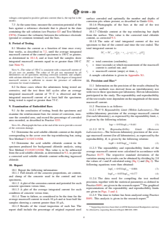 3.4 These test methods have been used elsewhere with good agreement between corrosion as measured by these test methods and corrosion damage on the embedded steel (1-4).4 These test methods might not properly rank the performance of different corrosion inhibitors, especially at concrete covers over the steel less than 40 mm (1.5 in.) or water-to-cement ratios above 0.45. The concrete mixture proportions and cover over the steel are chosen to accelerate chloride ingress. Some inhibitors might have an effect on this process, which could lead to results that would differ from what would be expected in actual use (5).
