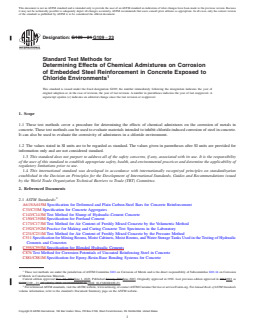 1.1 These test methods cover a procedure for determining the effects of chemical admixtures on the corrosion of metals in concrete. These test methods can be used to evaluate materials intended to inhibit chloride-induced corrosion of steel in concrete. It can also be used to evaluate the corrosivity of admixtures in a chloride environment.