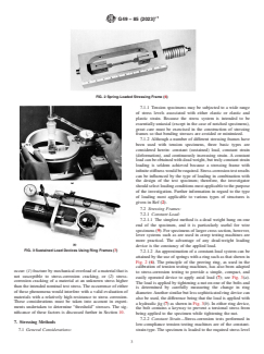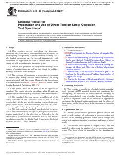 The practice provides guidance on applying uniaxial stresses using constant load, constant strain, or continuously increasing strain methods. Stressing frames and experimental setups are discussed to reduce errors due to bending, torsion, or non-axial loading. The document explores the impacts of loading types on test outcomes and the resulting evaluation of stress-corrosion resistance.Exposure to Corrosive Environments