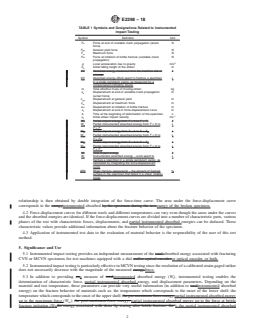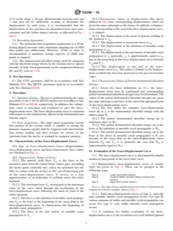 5.3 In addition to providing a measure of instrumented absorbed energy (Wt), instrumented testing enables the determination of characteristic force, partial instrumented absorbed energy, and displacement parameters. Depending on the material and test temperature, these parameters can provide very useful information (in addition to instrumented absorbed energy) on the fracture behavior of materials such as: the temperature which corresponds to the onset of the lower shelf; the temperature which corresponds to the onset of the upper shelf; partial instrumented absorbed energy up to the maximum force (Wm); partial instrumented absorbed energy up to the force at brittle fracture initiation (Wbf); the partial instrumented absorbed energy after the maximun force (Wt–Wm); the general yield force (Fgy); the force at brittle fracture initiation (Fbf); the arrest force (Fa). The instrumented data may also be used to highlight test results which should be discarded on the basis of misalignment or other critical test factors.