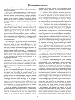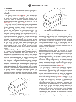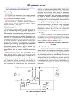 SIGNIFICANCE AND USE 4.1 Materials Evaluation—These test methods were developed to supplement the testing of Epstein specimens for applications involving the use of flat, sheared laminations where the testing of Epstein specimens in either the as-sheared or stress-relief-annealed condition fails to provide the most satisfactory method of predicting magnetic performance in the application. As a principal example, the test methods have been found particularly applicable to the control and evaluation of the magnetic properties of thermally flattened, grain-oriented electrical steel (Condition F5, Specification A876) used as lamination stock for cores of power transformers. Inasmuch as the test methods can only be reliably used to determine unidirectional magnetic properties, the test methods have limited applicability to the testing of fully processed nonoriented electrical steels as normally practiced (Specification A677). 4.2 Specification Acceptance—The reproducibility of test results and the accuracy relative to the 25-cm [250-mm] Epstein method of test are considered such as to render the test methods suitable for materials specification testing. 4.3 Interpretation of Test Results—Because of specimen size, considerable variation in magnetic properties may be present within a single specimen or between specimens that may be combined for testing purposes. Also, variations may exist in test values that are combined to represent a test lot of material. Test results reported will therefore, in general, represent averages of magnetic quality and in certain applications, particularly those involving narrow widths of laminations, deviations in magnetic performance from those expected from reported data may occur at times. Additionally, application of test data to the design or evaluation of a particular magnetic device must recognize the influence of magnetic circuitry upon performance and the possible deterioration in magnetic properties arising from construction of the device. 4.4 ... SCOPE 1.1 These test methods cover the determination of specific core loss and peak permeability of single layers of sheet-type specimens tested with normal excitation at a frequency of 50 or 60 Hz. Note 1: These test methods have been applied only at the commercial power frequencies, 50 and 60 Hz, but with proper instrumentation and application of the principles of testing and calibration embodied in the test methods, they are believed to be adaptable to testing at frequencies ranging from 25 to 400 Hz. 1.2 These test methods use calibration procedures that provide correlation with the 25-cm [250-mm] Epstein test. 1.3 The range of test magnetic flux densities is governed by the properties of the test specimen and by the available instruments and other equipment components. Normally, nonoriented electrical steels can be tested over a range from 8 to 16 kG [0.8 to 1.6 T] for core loss. For oriented electrical steels, the normal range extends to 18 kG [1.8 T]. Maximum magnetic flux densities in peak permeability testing are limited principally by heating of the magnetizing winding and tests are limited normally to a maximum ac magnetic field strength of about 150 Oe [12 000 A/m]. 1.4 These test methods cover two alternative procedures as follows: Test Method 1—Sections 6 – 12 Test Method 2—Sections 13 – 19 1.4.1 Test Method 1 uses a test fixture having (1) two windings that encircle the test specimen, and (2) a ferromagnetic yoke structure that serves as the flux return path and has low core loss and low magnetic reluctance. 1.4.2 Test Method 2 uses a test fixture having (1) two windings that encircle the test specimen, (2) a third winding located inside the other two windings and immediately adjacent to one surface of the test specimen, and (3) a ferromagnetic yoke structure which serves as the flux-return path and has low magnetic reluctance. 1.5 The values and equations stated in customary (cgs-emu a...
