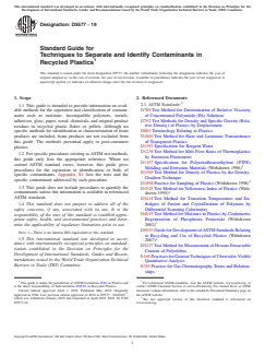 ASTM D5577-19 is a guide published by ASTM International. Its full title is "Standard Guide for Techniques to Separate and Identify Contaminants in Recycled Plastics". This standard covers: SIGNIFICANCE AND USE 5.1 Recycled plastic materials may contain incompatible plastic or other undesirable contaminants that could affect the processing or quality, or both, of the plastic prepared for reuse. Techniques to separate and identify incompatible plastics, moisture, chemicals, or original product residues, and solid contaminants such as metals, paper, glass, and wood are essential to the processing of recycled plastic materials. 5.2 This guide lists existing ASTM and ISO methods plus currently practiced industrial techniques for identification and classification of contaminants in recycled plastics flake or pellets. SCOPE 1.1 This guide is intended to provide information on available methods for the separation and classification of contaminants such as moisture, incompatible polymers, metals, adhesives, glass, paper, wood, chemicals, and original-product residues in recycled plastic flakes or pellets. Although no specific methods for identification or characterization of foam products are included, foam products are not excluded from this guide. The methods presented apply to post-consumer plastics. 1.2 For specific procedures existing as ASTM test methods, this guide only lists the appropriate reference. Where no current ASTM standard exists, however, this guide gives procedures for the separation or identification, or both, of specific contaminants. Appendix X1 lists the tests and the specific contaminant addressed by each procedure. 1.3 This guide does not include procedures to quantify the contaminants unless this information is available in referenced ASTM standards. 1.4 This standard does not purport to address all of the safety concerns, if any, associated with its use. It is the responsibility of the user of this standard to establish appropriate safety, health, and environmental practices and determine the applicability of regulatory limitations prior to use. Note 1: There is no known ISO equivalent to this standard. 1.5 This international standard was developed in accordance with internationally recognized principles on standardization established in the Decision on Principles for the Development of International Standards, Guides and Recommendations issued by the World Trade Organization Technical Barriers to Trade (TBT) Committee.