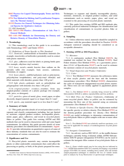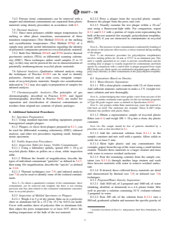 SIGNIFICANCE AND USE 5.1 Recycled plastic materials may contain incompatible plastic or other undesirable contaminants that could affect the processing or quality, or both, of the plastic prepared for reuse. Techniques to separate and identify incompatible plastics, moisture, chemicals, or original product residues, and solid contaminants such as metals, paper, glass, and wood are essential to the processing of recycled plastic materials. 5.2 This guide lists existing ASTM and ISO methods plus currently practiced industrial techniques for identification and classification of contaminants in recycled plastics flake or pellets. SCOPE 1.1 This guide is intended to provide information on available methods for the separation and classification of contaminants such as moisture, incompatible polymers, metals, adhesives, glass, paper, wood, chemicals, and original-product residues in recycled plastic flakes or pellets. Although no specific methods for identification or characterization of foam products are included, foam products are not excluded from this guide. The methods presented apply to post-consumer plastics. 1.2 For specific procedures existing as ASTM test methods, this guide only lists the appropriate reference. Where no current ASTM standard exists, however, this guide gives procedures for the separation or identification, or both, of specific contaminants. Appendix X1 lists the tests and the specific contaminant addressed by each procedure. 1.3 This guide does not include procedures to quantify the contaminants unless this information is available in referenced ASTM standards. 1.4 This standard does not purport to address all of the safety concerns, if any, associated with its use. It is the responsibility of the user of this standard to establish appropriate safety, health, and environmental practices and determine the applicability of regulatory limitations prior to use. Note 1: There is no known ISO equivalent to this standard. 1.5 This international standard was developed in accordance with internationally recognized principles on standardization established in the Decision on Principles for the Development of International Standards, Guides and Recommendations issued by the World Trade Organization Technical Barriers to Trade (TBT) Committee.
