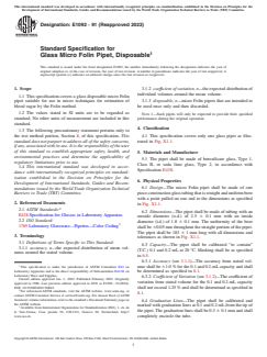 ABSTRACT This specification covers the classification, physical requirements, and testing of disposable glass micro Folin pipets suitable for use in micro techniques for the estimation of blood sugar by the Folin method. The pipets shall be made of Type 1, Class B borosilicate glass, or Type 2 soda lime glass. The physical properties to which the pipets shall adhere are design, dimensions, graduation lines, pipet nomenclature, color coding, marking permanency, and lot control. The pipets shall also be tested for capacity accuracy and coefficient of variation, and marking permanency. SCOPE 1.1 This specification covers a glass disposable micro Folin pipet suitable for use in micro techniques for estimation of blood sugar by the Folin method. 1.2 The values stated in SI units are to be regarded as standard. No other units of measurement are included in this standard. 1.3 The following precautionary statement pertains only to the test method portion, Section 8, of this specification. This standard does not purport to address all of the safety concerns, if any, associated with its use. It is the responsibility of the user of this standard to establish appropriate safety, health, and environmental practices and determine the applicability of regulatory limitations prior to use. 1.4 This international standard was developed in accordance with internationally recognized principles on standardization established in the Decision on Principles for the Development of International Standards, Guides and Recommendations issued by the World Trade Organization Technical Barriers to Trade (TBT) Committee.