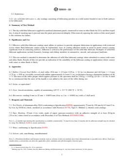 SIGNIFICANCE AND USE 5.1 Effective solid film lubricant coatings must adhere to surfaces to provide adequate lubrication in applications with restricted access where fluid lubricants cannot easily be replenished. Loss of coating adhesion results in metal to metal contact causing significant wear of contacting surfaces. Adhesion is critical to the performance of the solid film lubricant. Examples of solid film lubricant applications include fasteners, bearings and sliding members in automotive, aircraft, and aerospace hardware. 5.2 This test method is intended to determine the adhesion of solid film lubricant coatings when submitted to contact with water and other fluids. Results of this test provide an indication of the suitability of the lubricant coating in applications where contact with water or other fluids is likely. SCOPE 1.1 This test method2 covers the measurement of the adhesion characteristics of dry solid film lubricants. 1.2 The values stated in SI units are to be regarded as standard. 1.2.1 Exception—The values given in parentheses are provided for information only. 1.3 This standard does not purport to address all of the safety concerns, if any, associated with its use. It is the responsibility of the user of this standard to establish appropriate safety, health, and environmental practices and determine the applicability of regulatory limitations prior to use. 1.4 This international standard was developed in accordance with internationally recognized principles on standardization established in the Decision on Principles for the Development of International Standards, Guides and Recommendations issued by the World Trade Organization Technical Barriers to Trade (TBT) Committee.