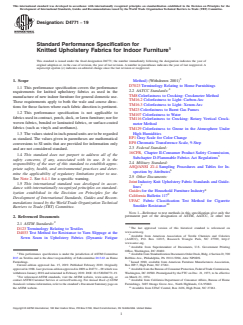 ASTM D4771-19 is a technical specification published by ASTM International. Its full title is "Standard Performance Specification for Knitted Upholstery Fabrics for Indoor Furniture". This standard covers: ABSTRACT This performance specification covers the performance requirements for knitted upholstery fabrics as used in the manufacture of new indoor furniture for general domestic use. These requirements apply to both the wale and course directions for those factors where each fabric direction is pertinent. This performance specification is not applicable to fabrics used in contract, porch, deck, or lawn furniture; nor for woven fabrics, bonded or laminated fabrics, or surface-coated fabrics (such as vinyls and urethanes). The fabric shall be tested for its resistance to yarn slippage, dimensional change, and colorfastness to water, solvent, crocking, burnt gas fumes, light, and ozone. After the fabric has been tested, it shall be evaluated for any change in hand, character, or appearance. The fabric shall be evaluated for cracking or peeling of the back coating to check the coating durability. The fabric flammability shall also be tested. All upholstery fabrics shall be evaluated for cigarette ignition resistance. SIGNIFICANCE AND USE 5.1 Fabrics intended for this end-use should meet all of the requirements listed in Table 1. 5.2 It should be recognized that fabrics can be produced utilizing an almost infinite number of combinations of construction variables (for example, type of fibers, percentage of fibers, yarn twist, yarn number, warp and pick count, chemical and mechanical finishes.) Additionally, fashion or aesthetics dictate that the ultimate consumer may find acceptable articles made from fabrics that do not conform to all of the requirements in Table 1. 5.2.1 Hence, no single performance specification can possibly apply to all the various fabrics that could be utilized for this end-use. 5.3 The uses and significance of particular properties and test method are discussed in the appropriate sections of the specified test methods. SCOPE 1.1 This performance specification covers the performance requirements for knitted upholstery fabrics as used in the manufacture of new indoor furniture for general domestic use. These requirements apply to both the wale and course directions for those factors where each fabric direction is pertinent. 1.2 This performance specification is not applicable to fabrics used in contract, porch, deck, or lawn furniture; nor for woven fabrics, bonded or laminated fabrics, or surface-coated fabrics (such as vinyls and urethanes). 1.3 The values stated in inch-pound units are to be regarded as standard. The values given in parentheses are mathematical conversions to SI units that are provided for information only and are not considered standard. 1.4 This standard does not purport to address all of the safety concerns, if any, associated with its use. It is the responsibility of the user of this standard to establish appropriate safety, health, and environmental practices and determine the applicability of regulatory limitations prior to use. See Note 2. See 6.4.1 for a specific warning. 1.5 This international standard was developed in accordance with internationally recognized principles on standardization established in the Decision on Principles for the Development of International Standards, Guides and Recommendations issued by the World Trade Organization Technical Barriers to Trade (TBT) Committee.