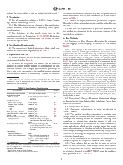ABSTRACT This performance specification covers the performance requirements for knitted upholstery fabrics as used in the manufacture of new indoor furniture for general domestic use. These requirements apply to both the wale and course directions for those factors where each fabric direction is pertinent. This performance specification is not applicable to fabrics used in contract, porch, deck, or lawn furniture; nor for woven fabrics, bonded or laminated fabrics, or surface-coated fabrics (such as vinyls and urethanes). The fabric shall be tested for its resistance to yarn slippage, dimensional change, and colorfastness to water, solvent, crocking, burnt gas fumes, light, and ozone. After the fabric has been tested, it shall be evaluated for any change in hand, character, or appearance. The fabric shall be evaluated for cracking or peeling of the back coating to check the coating durability. The fabric flammability shall also be tested. All upholstery fabrics shall be evaluated for cigarette ignition resistance. SIGNIFICANCE AND USE 5.1 Fabrics intended for this end-use should meet all of the requirements listed in Table 1. 5.2 It should be recognized that fabrics can be produced utilizing an almost infinite number of combinations of construction variables (for example, type of fibers, percentage of fibers, yarn twist, yarn number, warp and pick count, chemical and mechanical finishes.) Additionally, fashion or aesthetics dictate that the ultimate consumer may find acceptable articles made from fabrics that do not conform to all of the requirements in Table 1. 5.2.1 Hence, no single performance specification can possibly apply to all the various fabrics that could be utilized for this end-use. 5.3 The uses and significance of particular properties and test method are discussed in the appropriate sections of the specified test methods. SCOPE 1.1 This performance specification covers the performance requirements for knitted upholstery fabrics as used in the manufacture of new indoor furniture for general domestic use. These requirements apply to both the wale and course directions for those factors where each fabric direction is pertinent. 1.2 This performance specification is not applicable to fabrics used in contract, porch, deck, or lawn furniture; nor for woven fabrics, bonded or laminated fabrics, or surface-coated fabrics (such as vinyls and urethanes). 1.3 The values stated in inch-pound units are to be regarded as standard. The values given in parentheses are mathematical conversions to SI units that are provided for information only and are not considered standard. 1.4 This standard does not purport to address all of the safety concerns, if any, associated with its use. It is the responsibility of the user of this standard to establish appropriate safety, health, and environmental practices and determine the applicability of regulatory limitations prior to use. See Note 2. See 6.4.1 for a specific warning. 1.5 This international standard was developed in accordance with internationally recognized principles on standardization established in the Decision on Principles for the Development of International Standards, Guides and Recommendations issued by the World Trade Organization Technical Barriers to Trade (TBT) Committee.