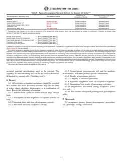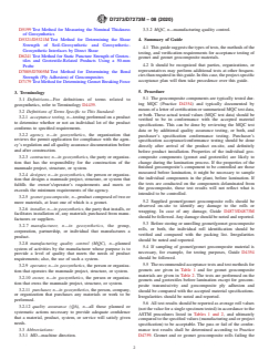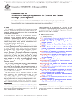 ASTM D7273/D7273M-08(2020) is a guide published by ASTM International. Its full title is "Standard Guide for Acceptance Testing Requirements for Geonets and Geonet Drainage Geocomposites". This standard covers: SCOPE 1.1 This guide covers guidelines for the acceptance testing frequency requirements for geonet and geonet drainage geocomposite materials describing types of tests, test methods, and recommended verifications. 1.2 This guide is intended to aid purchasers, installers, contractors, owners, operators, designers, and agencies in establishing a minimum level of effort for product acceptance testing and verification. This is intended to ensure that the supplied geonet and/or geonet drainage geocomposite roll(s) meet accepted material specifications. 1.3 This guide offers an organized collection of information or a series of options and does not recommend a specific course of action. This guide cannot replace education or experience and should be used in conjunction with professional judgment. Not all aspects of this guide may be applicable in all circumstances. This guide is not intended to represent or replace the standard of care by which the adequacy of a given professional service must be judged, nor should this guide be applied without consideration of a project's many unique aspects. The word “Standard” in the title of this guide means only that the guide has been approved through the ASTM International consensus process. 1.4 The values stated in either SI units or inch-pound units are to be regarded separately as standard. The values stated in each system are not necessarily exact equivalents; therefore, to ensure conformance with the standard, each system shall be used independently of the other, and values from the two systems shall not be combined. 1.5 This standard does not purport to address all of the safety concerns, if any, associated with its use. It is the responsibility of the user of this standard to establish appropriate safety, health, and environmental practices and determine the applicability of regulatory limitations prior to use. 1.6 This international standard was developed in accordance with internationally recognized principles on standardization established in the Decision on Principles for the Development of International Standards, Guides and Recommendations issued by the World Trade Organization Technical Barriers to Trade (TBT) Committee.