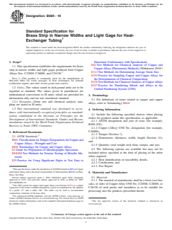 ASTM B569-19 is a technical specification published by ASTM International. Its full title is "Standard Specification for Brass Strip in Narrow Widths and Light Gage for Heat-Exchanger Tubing". This standard covers: ABSTRACT This specification establishes the requirements for brass strips in narrow widths and light gages produced from Copper Alloy UNS Nos. C23000, C26000, and C26130 to be used in heat exchanger tubing. The material for manufacture shall be a cast bar, cake, or slab of such purity and soundness as to be suitable for processing by hot working, cold working, and annealing to produce a uniform wrought structure in the finished product. Products shall be produced in tempers H01 (¼ hard), H02 (½ hard), O81 (annealed-to-temper, ¼ hard), and O82 (annealed-to-temper, ½ hard). Products shall be sampled and prepared, then tested accordingly to examine their conformance to dimensional (mass, thickness, width, and straightness), mechanical (tensile and yield strengths, and elongation), chemical composition, and grain size requirements. SCOPE 1.1 This specification establishes the requirements for brass strip in narrow widths and light gages produced from Copper Alloys Nos. C23000, C26000, and C26130.2 Note 1: This product is commonly used for the manufacture of thin-wall tubes for water passages in heat exchangers for internal combustion engines and other closed-system heat sources. 1.2 Units—The values stated in inch-pound units are to be regarded as standard. The values given in parentheses are mathematical conversions to SI units, which are provided for information only and are not considered standard. 1.2.1 Exception—Grain size and chemical analysis sampling are stated in SI units. 1.3 This international standard was developed in accordance with internationally recognized principles on standardization established in the Decision on Principles for the Development of International Standards, Guides and Recommendations issued by the World Trade Organization Technical Barriers to Trade (TBT) Committee.
