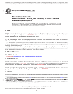 SIGNIFICANCE AND USE 3.1 This test method is intended to determine the effects of freezing and thawing on units conforming to the dimensional requirements of Specification C936/C936M while immersed in a test solution. Other types of segmental concrete paving units that do not conform to the dimensional requirements of Specification C936/C936M may be tested using this test method. 3.2 The results from this test method are not intended to provide a quantitative measure of the length of service from concrete paving units conforming to the dimensional requirements of Specification C936/C936M. SCOPE 1.1 This test method evaluates the resistance to freezing and thawing of solid interlocking concrete paving units conforming to the dimensional requirements of Specification C936/C936M. Units are tested in a test solution that is either tap water or 3 % saline solution, depending on the intended use of the units in actual service. 1.2 The values stated in SI units are to be regarded as standard. The values given in parentheses after SI units are provided for information only and are not considered standard. 1.3 This standard does not purport to address all of the safety concerns, if any, associated with its use. It is the responsibility of the user of this standard to establish appropriate safety, health, and environmental practices and determine the applicability of regulatory limitations prior to use. 1.4 This international standard was developed in accordance with internationally recognized principles on standardization established in the Decision on Principles for the Development of International Standards, Guides and Recommendations issued by the World Trade Organization Technical Barriers to Trade (TBT) Committee.
