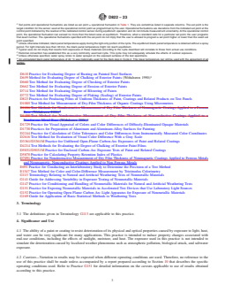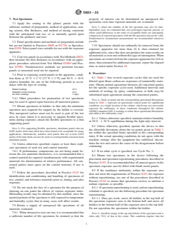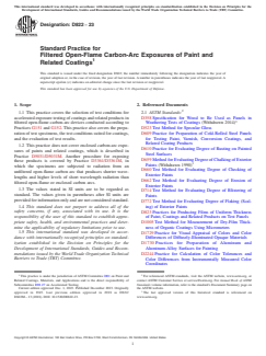 ASTM D822-23 is a standard published by ASTM International. Its full title is "Standard Practice for Filtered Open-Flame Carbon-Arc Exposures of Paint and Related Coatings". This standard covers: SIGNIFICANCE AND USE 4.1 The ability of a paint or coating to resist deterioration of its physical and optical properties caused by exposure to light, heat, and water can be very significant for many applications. This practice is intended to induce property changes associated with end-use conditions, including the effects of sunlight, moisture, and heat. The exposure used in this practice is not intended to simulate the deterioration caused by localized weather phenomena such as atmospheric pollution, biological attack, and saltwater exposure. 4.2 Cautions—Variation in results may be expected when different operating conditions are used. Therefore, no reference to the use of this practice shall be made unless accompanied by a report prepared according to Section 10 that describes the specific operating conditions used. Refer to Practice G151 for detailed information on the caveats applicable to use of results obtained according to this practice. Note 1: Additional information on sources of variability and on strategies for addressing variability in the design, execution, and data analysis of laboratory accelerated exposure tests is found in Guide G141. 4.2.1 The spectral power distribution of light from an open-flame carbon-arc is significantly different from that produced in light and water exposure devices using other carbon-arc configurations or other light sources. The type and rate of degradation and the performance rankings produced by exposures to filtered open-flame carbon-arcs can be much different from those produced by exposures to other types of laboratory light sources. 4.2.2 Interlaboratory comparisons are valid only when all laboratories use the same type of carbon-arc, filters, and exposure conditions. 4.3 Reproducibility of test results between laboratories has been shown to be good when the stability of materials is evaluated in terms of performance ranking compared to other materials or to a control.4,5 Therefore, exposure of a similar material of known... SCOPE 1.1 This practice covers the selection of test conditions for accelerated exposure testing of coatings and related products in filtered open-flame carbon-arc devices conducted according to Practices G151 and G152. This practice also covers the preparation of test specimens, the test conditions suited for coatings, and the evaluation of test results. 1.2 This practice does not cover enclosed carbon-arc exposures of paints and related coatings, which is described in Practice D5031/D5031M. Another procedure for exposing these products is covered by Practice D3361/D3361M, in which the specimens are subjected to radiation from an unfiltered open-flame carbon arc that produces shorter wavelengths and higher levels of short wavelength radiation than filtered open-flame or enclosed carbon arcs. 1.3 The values stated in SI units are to be regarded as standard. The values given in parentheses after SI units are provided for information only and are not considered standard. 1.4 This standard does not purport to address all of the safety concerns, if any, associated with its use. It is the responsibility of the user of this standard to establish appropriate safety, health, and environmental practices and determine the applicability of regulatory limitations prior to use. 1.5 This international standard was developed in accordance with internationally recognized principles on standardization established in the Decision on Principles for the Development of International Standards, Guides and Recommendations issued by the World Trade Organization Technical Barriers to Trade (TBT) Committee.