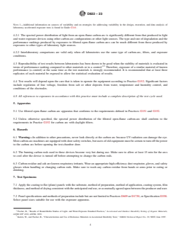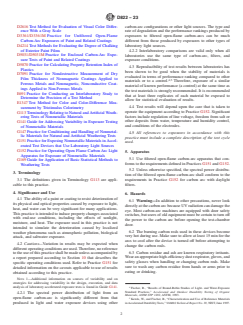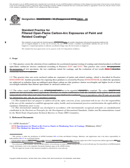 SIGNIFICANCE AND USE 4.1 The ability of a paint or coating to resist deterioration of its physical and optical properties caused by exposure to light, heat, and water can be very significant for many applications. This practice is intended to induce property changes associated with end-use conditions, including the effects of sunlight, moisture, and heat. The exposure used in this practice is not intended to simulate the deterioration caused by localized weather phenomena such as atmospheric pollution, biological attack, and saltwater exposure. 4.2 Cautions—Variation in results may be expected when different operating conditions are used. Therefore, no reference to the use of this practice shall be made unless accompanied by a report prepared according to Section 10 that describes the specific operating conditions used. Refer to Practice G151 for detailed information on the caveats applicable to use of results obtained according to this practice. Note 1: Additional information on sources of variability and on strategies for addressing variability in the design, execution, and data analysis of laboratory accelerated exposure tests is found in Guide G141. 4.2.1 The spectral power distribution of light from an open-flame carbon-arc is significantly different from that produced in light and water exposure devices using other carbon-arc configurations or other light sources. The type and rate of degradation and the performance rankings produced by exposures to filtered open-flame carbon-arcs can be much different from those produced by exposures to other types of laboratory light sources. 4.2.2 Interlaboratory comparisons are valid only when all laboratories use the same type of carbon-arc, filters, and exposure conditions. 4.3 Reproducibility of test results between laboratories has been shown to be good when the stability of materials is evaluated in terms of performance ranking compared to other materials or to a control.4,5 Therefore, exposure of a similar material of known... SCOPE 1.1 This practice covers the selection of test conditions for accelerated exposure testing of coatings and related products in filtered open-flame carbon-arc devices conducted according to Practices G151 and G152. This practice also covers the preparation of test specimens, the test conditions suited for coatings, and the evaluation of test results. 1.2 This practice does not cover enclosed carbon-arc exposures of paints and related coatings, which is described in Practice D5031/D5031M. Another procedure for exposing these products is covered by Practice D3361/D3361M, in which the specimens are subjected to radiation from an unfiltered open-flame carbon arc that produces shorter wavelengths and higher levels of short wavelength radiation than filtered open-flame or enclosed carbon arcs. 1.3 The values stated in SI units are to be regarded as standard. The values given in parentheses after SI units are provided for information only and are not considered standard. 1.4 This standard does not purport to address all of the safety concerns, if any, associated with its use. It is the responsibility of the user of this standard to establish appropriate safety, health, and environmental practices and determine the applicability of regulatory limitations prior to use. 1.5 This international standard was developed in accordance with internationally recognized principles on standardization established in the Decision on Principles for the Development of International Standards, Guides and Recommendations issued by the World Trade Organization Technical Barriers to Trade (TBT) Committee.