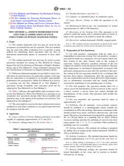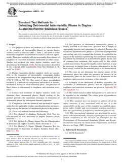 ABSTRACT These test methods cover the detection of detrimental intermetallic phase in duplex austenitic/ferritic stainless steel to the extent that toughness and corrosion resistance is affected significantly. These test methods will not necessarily detect losses of toughness or corrosion resistance attributable to other causes. Test method A-sodium hydroxide etch test, test method B-Charpy impact test, and test method C-ferric chloride corrosion test shall be made for classification of structures of duplex stainless steels. SCOPE 1.1 The purpose of these test methods is to allow detection of the presence of intermetallic phases in certain duplex stainless steels as listed in Table 1, Table 2, and Table 3 to the extent that toughness or corrosion resistance is affected significantly. These test methods will not necessarily detect losses of toughness or corrosion resistance attributable to other causes. Similar test methods for other duplex stainless steels are described in Test Method A1084, but the procedures described in this standard differ significantly from Test Methods A, B, and C in A1084. 1.2 Duplex (austenitic-ferritic) stainless steels are susceptible to the formation of intermetallic compounds during exposures in the temperature range from approximately 600 to 1750 °F (320 to 955 °C). The speed of these precipitation reactions is a function of composition and thermal or thermomechanical history of each individual piece. The presence of these phases is detrimental to toughness and corrosion resistance. 1.3 Correct heat treatment of duplex stainless steels can eliminate these detrimental phases. Rapid cooling of the product provides the maximum resistance to formation of detrimental phases by subsequent thermal exposures. 1.4 Compliance with the chemical and mechanical requirements for the applicable product specification does not necessarily indicate the absence of detrimental phases in the product. 1.5 These test methods include the following: 1.5.1 Test Method A—Sodium Hydroxide Etch Test for Classification of Etch Structures of Duplex Stainless Steels (Sections 3 – 7). 1.5.2 Test Method B—Charpy Impact Test for Classification of Structures of Duplex Stainless Steels (Sections 8 – 13). 1.5.3 Test Method C—Ferric Chloride Corrosion Test for Classification of Structures of Duplex Stainless Steels (Sections 14 – 20). 1.6 The presence of detrimental intermetallic phases is readily detected in all three tests, provided that a sample of appropriate location and orientation is selected. Because the occurrence of intermetallic phases is a function of temperature and cooling rate, it is essential that the tests be applied to the region of the material experiencing the conditions most likely to promote the formation of an intermetallic phase. In the case of common heat treatment, this region will be that which cooled most slowly. Except for rapidly cooled material, it may be necessary to sample from a location determined to be the most slowly cooled for the material piece to be characterized. 1.7 The tests do not determine the precise nature of the detrimental phase but rather the presence or absence of an intermetallic phase to the extent that it is detrimental to the toughness and corrosion resistance of the material. 1.8 Examples of the correlation of thermal exposures, the occurrence of intermetallic phases, and the degradation of toughness and corrosion resistance are given in Appendix X1 and Appendix X2. 1.9 The values stated in either inch-pound or SI units are to be regarded as the standard. The values given in parentheses are for information only. 1.10 This standard does not purport to address all of the safety concerns, if any, associated with its use. It is the responsibility of the user of this standard to establish appropriate safety, health, and environmental practices and determine the applicability of regulatory limitations prior to use. 1.11 This internat...