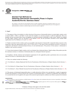 1.1 The purpose of these test methods is to allow detection of the presence of intermetallic phases in certain duplex stainless steels as listed in Table 1, Table 2, and Table 3 to the extent that toughness or corrosion resistance is affected significantly. These test methods will not necessarily detect losses of toughness or corrosion resistance attributable to other causes. Similar test methods for other duplex stainless steels are described in Test Method A1084, but the procedures described in this standard differ significantly from Test Methods A, B, and C in A1084.