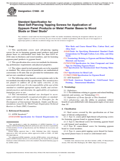 ASTM C1002-22 is a technical specification published by ASTM International. Its full title is "Standard Specification for Steel Self-Piercing Tapping Screws for Application of Gypsum Panel Products or Metal Plaster Bases to Wood Studs or Steel Studs". This standard covers: ABSTRACT This specification covers steel self-piercing tapping screws for use in fastening gypsum panel products and metal plaster bases to cold-formed steel studs and wood members and for fastening gypsum panel products to gypsum board. Steel screws covered by this specification are of four types of thread configurations: (1) Type G, course-pitch high-thread self-piercing screws for fastening gypsum board to gypsum board; (2) Type S, fine-thread screw for fastening gypsum board to cold formed steel members; (3) Type W, course-thread screw for fastening gypsum board to wood members; and (4) Type A, course-pitch tapping screw thread for fastening metal plaster bases to wood or cold-formed steel. All these steel screw types shall be tested for the determination of performance requirements and physical properties (hardness and ductility) covered in this specification. For the appearance of screws, the form shall be straight and neatly formed, and the threads shall be clean and smooth. Screws shall also have a corrosion-resistant treatment which shall not inhibit adhesion to finishing compounds nor bleed through field-applied decoration. SCOPE 1.1 This specification covers steel self-piercing tapping screws for use in fastening gypsum panel products and metal plaster bases to cold-formed steel studs less than 0.033 in. (0.84 mm) in thickness and wood members, and for fastening gypsum panel products to gypsum board. 1.2 This specification also covers test methods for determining performance requirements and physical properties. 1.3 The values stated in inch-pound units are to be regarded as standard. The values given in parentheses are mathematical conversions to SI units that are provided for information only and are not considered standard. 1.4 The following safety hazards caveat pertains only to the test methods described in this specification: This standard does not purport to address all of the safety concerns, if any, associated with its use. It is the responsibility of the user of this standard to establish appropriate safety, health, and environmental practices and determine the applicability of regulatory limitations prior to use. 1.5 This international standard was developed in accordance with internationally recognized principles on standardization established in the Decision on Principles for the Development of International Standards, Guides and Recommendations issued by the World Trade Organization Technical Barriers to Trade (TBT) Committee.