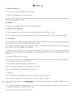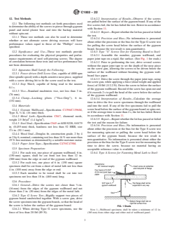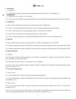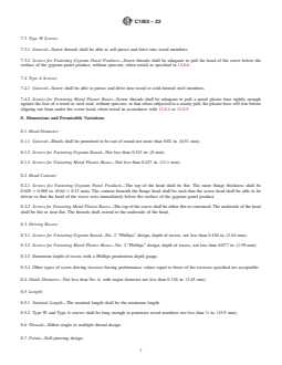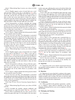 ABSTRACT This specification covers steel self-piercing tapping screws for use in fastening gypsum panel products and metal plaster bases to cold-formed steel studs and wood members and for fastening gypsum panel products to gypsum board. Steel screws covered by this specification are of four types of thread configurations: (1) Type G, course-pitch high-thread self-piercing screws for fastening gypsum board to gypsum board; (2) Type S, fine-thread screw for fastening gypsum board to cold formed steel members; (3) Type W, course-thread screw for fastening gypsum board to wood members; and (4) Type A, course-pitch tapping screw thread for fastening metal plaster bases to wood or cold-formed steel. All these steel screw types shall be tested for the determination of performance requirements and physical properties (hardness and ductility) covered in this specification. For the appearance of screws, the form shall be straight and neatly formed, and the threads shall be clean and smooth. Screws shall also have a corrosion-resistant treatment which shall not inhibit adhesion to finishing compounds nor bleed through field-applied decoration. SCOPE 1.1 This specification covers steel self-piercing tapping screws for use in fastening gypsum panel products and metal plaster bases to cold-formed steel studs less than 0.033 in. (0.84 mm) in thickness and wood members, and for fastening gypsum panel products to gypsum board. 1.2 This specification also covers test methods for determining performance requirements and physical properties. 1.3 The values stated in inch-pound units are to be regarded as standard. The values given in parentheses are mathematical conversions to SI units that are provided for information only and are not considered standard. 1.4 The following safety hazards caveat pertains only to the test methods described in this specification: This standard does not purport to address all of the safety concerns, if any, associated with its use. It is the responsibility of the user of this standard to establish appropriate safety, health, and environmental practices and determine the applicability of regulatory limitations prior to use. 1.5 This international standard was developed in accordance with internationally recognized principles on standardization established in the Decision on Principles for the Development of International Standards, Guides and Recommendations issued by the World Trade Organization Technical Barriers to Trade (TBT) Committee.