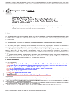 1.1 This specification covers steel self-piercing tapping screws for use in fastening gypsum panel products and metal plaster bases to cold-formed steel studs less than 0.033 in. (0.84 mm) in thickness and wood members, and for fastening gypsum panel products to gypsum board.