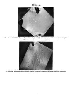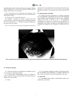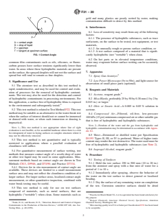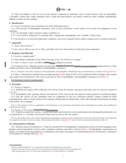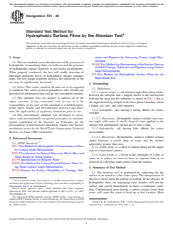 ASTM F21-20 is a standard published by ASTM International. Its full title is "Standard Test Method for Hydrophobic Surface Films by the Atomizer Test". This standard covers: SIGNIFICANCE AND USE 5.1 The atomizer test as described in this test method is rapid, nondestructive, and may be used for control and evaluation of processes for the removal of hydrophobic contaminants. The test may also be used for the detection and control of hydrophobic contaminants in processing environments. For this application, a surface free of hydrophobic films is exposed to the environment and subsequently tested.4 5.2 This test method is related to Test Method F22. This test method may be suitable as an alternative to the water-break test when the surface of interest should not or cannot be immersed or doused with water, or when such immersion or dousing is impractical. Note 1: This test method is not appropriate where line of sight evaluation is not feasible; or for assembled hardware where there is a risk for entrapment of water in faying surfaces or complex structures where it may not be effectively removed. 5.3 This test method is not quantitative and is typically restricted to applications where a pass/fail evaluation of cleanliness will suffice. 5.4 For quantitative measurement of surface wetting, test methods that measure contact angle of a sessile drop of water or other test liquid may be used in some applications. Measurement methods based on contact angle are shown in Test Methods C813, D5946, and D7490; and Practice D7334. 5.4.1 Devices for in situ measurement of contact angle are available. These devices are limited to a small measurement surface area and may not reflect the cleanliness condition of a larger surface. For larger surface areas, localized contact angle measurement, or other quantitative inspection, combined with water break testing may be useful. 5.5 This test method is only for use on test surfaces composed of materials, such as metal surfaces, that are hydrophilic (“wettable”) when clean. Some materials such as gold and many plastics are poorly wetted by water, making contamination difficult to detect by this method. SCOPE 1.1 This test method covers the detection of the presence of hydrophobic (nonwetting) films on surfaces and the presence of hydrophobic organic materials in processing environments. When properly conducted, the test will enable detection of fractional molecular layers of hydrophobic organic contaminants. On very rough or porous surfaces, the sensitivity of the test may be significantly decreased. 1.2 Units—The values stated in SI units are to be regarded as standard. The values given in parentheses after SI units are provided for information only and are not considered standard. 1.3 This standard does not purport to address all of the safety concerns, if any, associated with its use. It is the responsibility of the user of this standard to establish appropriate safety, health, and environmental practices and determine the applicability of regulatory limitations prior to use. 1.4 This international standard was developed in accordance with internationally recognized principles on standardization established in the Decision on Principles for the Development of International Standards, Guides and Recommendations issued by the World Trade Organization Technical Barriers to Trade (TBT) Committee.