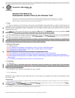 SIGNIFICANCE AND USE 5.1 The atomizer test as described in this test method is rapid, nondestructive, and may be used for control and evaluation of processes for the removal of hydrophobic contaminants. The test may also be used for the detection and control of hydrophobic contaminants in processing environments. For this application, a surface free of hydrophobic films is exposed to the environment and subsequently tested.4 5.2 This test method is related to Test Method F22. This test method may be suitable as an alternative to the water-break test when the surface of interest should not or cannot be immersed or doused with water, or when such immersion or dousing is impractical. Note 1: This test method is not appropriate where line of sight evaluation is not feasible; or for assembled hardware where there is a risk for entrapment of water in faying surfaces or complex structures where it may not be effectively removed. 5.3 This test method is not quantitative and is typically restricted to applications where a pass/fail evaluation of cleanliness will suffice. 5.4 For quantitative measurement of surface wetting, test methods that measure contact angle of a sessile drop of water or other test liquid may be used in some applications. Measurement methods based on contact angle are shown in Test Methods C813, D5946, and D7490; and Practice D7334. 5.4.1 Devices for in situ measurement of contact angle are available. These devices are limited to a small measurement surface area and may not reflect the cleanliness condition of a larger surface. For larger surface areas, localized contact angle measurement, or other quantitative inspection, combined with water break testing may be useful. 5.5 This test method is only for use on test surfaces composed of materials, such as metal surfaces, that are hydrophilic (“wettable”) when clean. Some materials such as gold and many plastics are poorly wetted by water, making contamination difficult to detect by this method. SCOPE 1.1 This test method covers the detection of the presence of hydrophobic (nonwetting) films on surfaces and the presence of hydrophobic organic materials in processing environments. When properly conducted, the test will enable detection of fractional molecular layers of hydrophobic organic contaminants. On very rough or porous surfaces, the sensitivity of the test may be significantly decreased. 1.2 Units—The values stated in SI units are to be regarded as standard. The values given in parentheses after SI units are provided for information only and are not considered standard. 1.3 This standard does not purport to address all of the safety concerns, if any, associated with its use. It is the responsibility of the user of this standard to establish appropriate safety, health, and environmental practices and determine the applicability of regulatory limitations prior to use. 1.4 This international standard was developed in accordance with internationally recognized principles on standardization established in the Decision on Principles for the Development of International Standards, Guides and Recommendations issued by the World Trade Organization Technical Barriers to Trade (TBT) Committee.