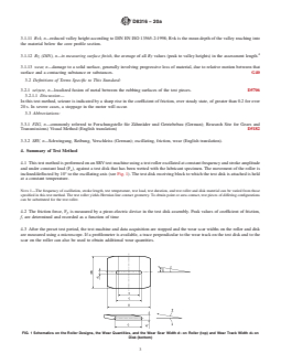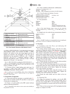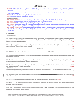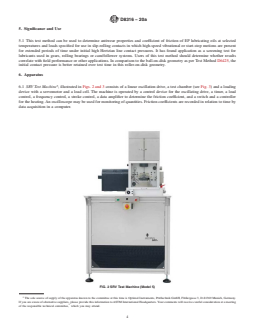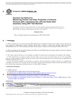SIGNIFICANCE AND USE 5.1 This test method can be used to determine antiwear properties and coefficient of friction of EP lubricating oils at selected temperatures and loads specified for use in slip-rolling contacts in which high-speed vibrational or start-stop motions are present for extended periods of time under initial high Hertzian line contact pressures. It has found application as a screening test for lubricants used in gears, rolling bearings or cam/follower systems. Users of this test method should determine whether results correlate with field performance or other applications. In comparison to the ball-on-disk geometry as per Test Method D6425, the initial contact pressure is better retained over test time in this roller-on-disk geometry. SCOPE 1.1 This test method covers an extreme pressure (EP) lubricating oil’s coefficient of friction and its ability to protect against wear when subjected to high-frequency, linear oscillation motion. The test utilizes a roller-on-disc geometry, where the roller is inclined/deflected by 10° to the oscillating movement. The procedure is identical to that described in DIN 51834, Part 4. 1.2 This test method can also be used to determine the ability of a non-EP lubricating oil to protect against wear and its coefficient of friction under similar test conditions. 1.3 The values stated in SI units are to be regarded as standard. No other units of measurement are included in this standard. 1.4 This standard does not purport to address all of the safety concerns, if any, associated with its use. It is the responsibility of the user of this standard to establish appropriate safety, health, and environmental practices and determine the applicability of regulatory limitations prior to use. 1.5 This international standard was developed in accordance with internationally recognized principles on standardization established in the Decision on Principles for the Development of International Standards, Guides and Recommendations issued by the World Trade Organization Technical Barriers to Trade (TBT) Committee.
