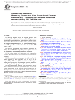 ASTM D8316-20a is a standard published by ASTM International. Its full title is "Standard Test Method for Measuring Friction and Wear Properties of Extreme Pressure (EP) Lubricating Oils with the Roller-Disk Geometry Using SRV Test Machine". This standard covers: SIGNIFICANCE AND USE 5.1 This test method can be used to determine antiwear properties and coefficient of friction of EP lubricating oils at selected temperatures and loads specified for use in slip-rolling contacts in which high-speed vibrational or start-stop motions are present for extended periods of time under initial high Hertzian line contact pressures. It has found application as a screening test for lubricants used in gears, rolling bearings or cam/follower systems. Users of this test method should determine whether results correlate with field performance or other applications. In comparison to the ball-on-disk geometry as per Test Method D6425, the initial contact pressure is better retained over test time in this roller-on-disk geometry. SCOPE 1.1 This test method covers an extreme pressure (EP) lubricating oil’s coefficient of friction and its ability to protect against wear when subjected to high-frequency, linear oscillation motion. The test utilizes a roller-on-disc geometry, where the roller is inclined/deflected by 10° to the oscillating movement. The procedure is identical to that described in DIN 51834, Part 4. 1.2 This test method can also be used to determine the ability of a non-EP lubricating oil to protect against wear and its coefficient of friction under similar test conditions. 1.3 The values stated in SI units are to be regarded as standard. No other units of measurement are included in this standard. 1.4 This standard does not purport to address all of the safety concerns, if any, associated with its use. It is the responsibility of the user of this standard to establish appropriate safety, health, and environmental practices and determine the applicability of regulatory limitations prior to use. 1.5 This international standard was developed in accordance with internationally recognized principles on standardization established in the Decision on Principles for the Development of International Standards, Guides and Recommendations issued by the World Trade Organization Technical Barriers to Trade (TBT) Committee.