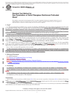 1.1 This dye-penetrant test method covers a means of evaluating solid fiberglass all-roving reinforced pultruded rod or bar stock for longitudinal wicking. There are generally three mechanisms that promote wicking such as delaminations, longitudinal continuous voids, or the presence of hollow fibers. Any or all of them will be operating at a given time.