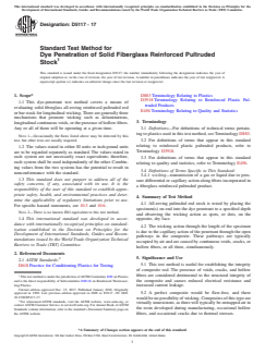 ASTM D5117-17 is a standard published by ASTM International. Its full title is "Standard Test Method for Dye Penetration of Solid Fiberglass Reinforced Pultruded Stock". This standard covers: SIGNIFICANCE AND USE 5.1 This test method is useful for establishing the integrity of composite rod. The presence of voids, cracks, and hollow fibers are considered detrimental to the structural integrity of the composite and causes reduced electrical resistance and increased current leakage. 5.2 A perfect composite would be flaw-free, and there would be no possibility of wicking. Composites of this type are virtually nonexistent, as there will typically be entrapped air in the resin developed during manufacturing, occasional hollow fibers, and occasional cracks due to thermal stresses. 5.3 This test method is intended to provide a tool for measuring the extent of wicking in a composite over very short lengths of material for comparative purposes. The presence of wicking over 1 in. (2.54 cm) lengths will not necessarily imply that the composite will perform unsatisfactorily for its intended end-use. Therefore, interpretation of test results shall be made carefully. 5.4 This test method was developed as a technique for estimating quality and consistency of pultruded rod and bar stock, which is a composite of resin and all-roving reinforcement. This test method will be useful for a manufacturer to determine whether any gross changes in quality have taken place due to process or raw material changes as the manufacturing process also affects the quality of the product. 5.5 Since the results of this test are so sensitive to sample size, penetrant type, penetrant used, viscosity, duration of test, and other factors, no attempt to arrive at or recommend development of a specification for these materials has been made. A specification shall be negotiated between supplier and end user and such specification shall be made with great care. SCOPE 1.1 This dye-penetrant test method covers a means of evaluating solid fiberglass all-roving reinforced pultruded rod or bar stock for longitudinal wicking. There are generally three mechanisms that promote wicking such as delaminations, longitudinal continuous voids, or the presence of hollow fibers. Any or all of them will be operating at a given time. Note 1: Occasionally the flaws listed above may be detected by this test, but other tests are usually required. 1.2 The values stated in either SI units or inch-pound units are to be regarded separately as standard. The values stated in each system are not necessarily exact equivalents; therefore, each system shall be used independently of the other. Combining values from the two systems has the potential to result in nonconformance with the standard. 1.3 This standard does not purport to address all of the safety concerns, if any, associated with its use. It is the responsibility of the user of this standard to establish appropriate safety, health, and environmental practices and determine the applicability of regulatory limitations prior to use. For specific hazard statements, see 10.3 and 10.6. Note 2: There is no known ISO equivalent to this test method. 1.4 This international standard was developed in accordance with internationally recognized principles on standardization established in the Decision on Principles for the Development of International Standards, Guides and Recommendations issued by the World Trade Organization Technical Barriers to Trade (TBT) Committee.
