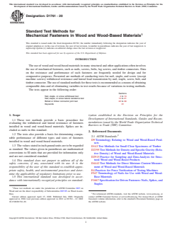 ASTM D1761-20 is a standard published by ASTM International. Its full title is "Standard Test Methods for Mechanical Fasteners in Wood and Wood-Based Materials". This standard covers: SIGNIFICANCE AND USE 5.1 The resistance of a species of wood or a wood-based product to withdrawal of nails, staples, or screws is a measure of its ability to hold or be held to an adjoining object by means of such fasteners. Factors that affect this withdrawal resistance include the physical and mechanical properties of the wood; the size, shape, and surface condition of the fasteners; the speed of withdrawal; physical changes to wood or fasteners between time of driving and time of withdrawal; orientation of the fastener relative to the fiber axis; and the occurrence and nature of pre-bored lead holes. 5.2 By using consistent sizes and types of nails, staples, and screws, withdrawal resistance of a wood species or wood product can be determined, and such values for two or more wood species or wood products can be compared. Similarly, comparative performances of different sizes or types of nails, staples, or screws can be determined by using a standard procedure with a particular wood or wood-based product, which eliminates the wood or the wood-based product as a variable. Since differences in test methods can have considerable influence on results, it is important that a standard procedure be specified and adhered to if test values are to be related to other test results. SCOPE 1.1 These test methods provide a basic procedure for evaluating the withdrawal and lateral resistance of fasteners installed in wood and wood-based materials. Spikes are included as nails in this standard. 1.2 The tests also provide a basis for determining comparable performance of different types and sizes of fasteners installed in wood and wood-based materials. 1.3 The values stated in inch-pound units are to be regarded as standard. The values given in parentheses are mathematical conversions to SI units that are provided for information only and are not considered standard. 1.4 This standard does not purport to address all of the safety concerns, if any, associated with its use. It is the responsibility of the user of this standard to establish appropriate safety, health, and environmental practices and determine the applicability of regulatory limitations prior to use. 1.5 This international standard was developed in accordance with internationally recognized principles on standardization established in the Decision on Principles for the Development of International Standards, Guides and Recommendations issued by the World Trade Organization Technical Barriers to Trade (TBT) Committee.