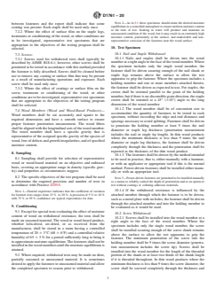 SIGNIFICANCE AND USE 5.1 The resistance of a species of wood or a wood-based product to withdrawal of nails, staples, or screws is a measure of its ability to hold or be held to an adjoining object by means of such fasteners. Factors that affect this withdrawal resistance include the physical and mechanical properties of the wood; the size, shape, and surface condition of the fasteners; the speed of withdrawal; physical changes to wood or fasteners between time of driving and time of withdrawal; orientation of the fastener relative to the fiber axis; and the occurrence and nature of pre-bored lead holes. 5.2 By using consistent sizes and types of nails, staples, and screws, withdrawal resistance of a wood species or wood product can be determined, and such values for two or more wood species or wood products can be compared. Similarly, comparative performances of different sizes or types of nails, staples, or screws can be determined by using a standard procedure with a particular wood or wood-based product, which eliminates the wood or the wood-based product as a variable. Since differences in test methods can have considerable influence on results, it is important that a standard procedure be specified and adhered to if test values are to be related to other test results. SCOPE 1.1 These test methods provide a basic procedure for evaluating the withdrawal and lateral resistance of fasteners installed in wood and wood-based materials. Spikes are included as nails in this standard. 1.2 The tests also provide a basis for determining comparable performance of different types and sizes of fasteners installed in wood and wood-based materials. 1.3 The values stated in inch-pound units are to be regarded as standard. The values given in parentheses are mathematical conversions to SI units that are provided for information only and are not considered standard. 1.4 This standard does not purport to address all of the safety concerns, if any, associated with its use. It is the responsibility of the user of this standard to establish appropriate safety, health, and environmental practices and determine the applicability of regulatory limitations prior to use. 1.5 This international standard was developed in accordance with internationally recognized principles on standardization established in the Decision on Principles for the Development of International Standards, Guides and Recommendations issued by the World Trade Organization Technical Barriers to Trade (TBT) Committee.