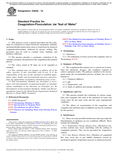 ASTM D2035-19 is a standard published by ASTM International. Its full title is "Standard Practice for Coagulation-Flocculation Jar Test of Water". This standard covers: SIGNIFICANCE AND USE 5.1 This practice permits the evaluation of various coagulants and coagulant aids used in the treatment of water and waste water for the same water and the same experimental conditions. 5.2 The effects of concentration of the coagulants and coagulant aids and their order of addition can also be evaluated by this practice. SCOPE 1.1 This practice covers a general procedure for the evaluation of a treatment to reduce dissolved, suspended, colloidal, and nonsettleable matter from water or wastewater by chemical coagulation-flocculation, followed by gravity settling. The procedure may be used to evaluate color, turbidity, and hardness reduction. 1.2 The practice provides a systematic evaluation of the variables normally encountered in the coagulation-flocculation process. 1.3 The values stated in SI units are to be regarded as standard. 1.4 This standard does not purport to address all of the safety concerns, if any, associated with its use. It is the responsibility of the user of this standard to establish appropriate safety, health, and environmental practices and determine the applicability of regulatory limitations prior to use. 1.5 This international standard was developed in accordance with internationally recognized principles on standardization established in the Decision on Principles for the Development of International Standards, Guides and Recommendations issued by the World Trade Organization Technical Barriers to Trade (TBT) Committee.