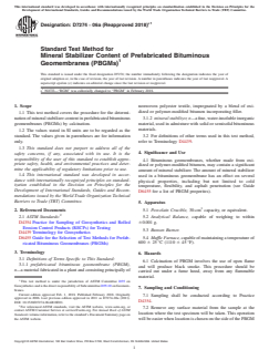 ASTM D7274-06A(2018)e1 is a standard published by ASTM International. Its full title is "Standard Test Method for Mineral Stabilizer Content of Prefabricated Bituminous Geomembranes (PBGMs)". This standard covers: SIGNIFICANCE AND USE 4.1 Bituminous geomembranes, whether made from oxidized or polymer-modified bitumen, may contain a significant amount of mineral stabilizer. The amount of mineral stabilizer used in a bituminous geomembrane has an effect on several physical properties, including but not limited to cold temperature, flexibility, and asphalt penetration (see Guide D6455 for a list of PBGM properites). SCOPE 1.1 This test method covers the procedure for the determination of mineral stabilizer content in prefabricated bituminous geomembranes (PBGMs) by calcination. 1.2 The values stated in SI units are to be regarded as the standard. The values given in parentheses are for information only. 1.3 This standard does not purport to address all of the safety concerns, if any, associated with its use. It is the responsibility of the user of this standard to establish appropriate safety, health, and environmental practices and determine the applicability of regulatory limitations prior to use. 1.4 This international standard was developed in accordance with internationally recognized principles on standardization established in the Decision on Principles for the Development of International Standards, Guides and Recommendations issued by the World Trade Organization Technical Barriers to Trade (TBT) Committee.