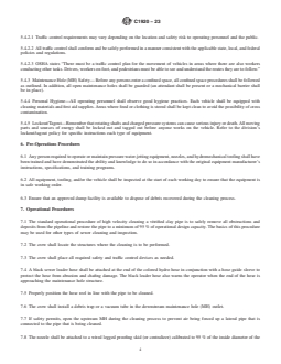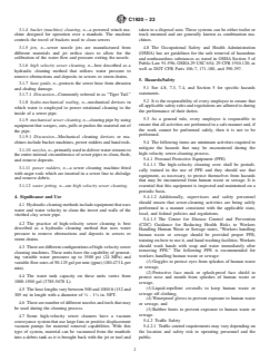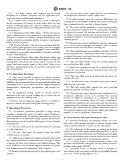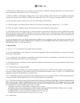 SIGNIFICANCE AND USE 4.1 Hydraulic cleaning methods include equipment that uses water and water velocity to clean the invert and walls of the vitrified clay sewer pipe. 4.2 The practice of high-velocity sewer cleaning is best described as a hydraulic cleaning method that uses water pressure to remove obstructions and deposits in sewers or storm drains. 4.3 There are different configurations of high-velocity sewer cleaning machines. These units have the capability of generating variable water pressures up to 3500 psi (24 MPa) and variable flow rates of 50-125 gal per min (gpm) (180-473 L per min). 4.4 The water tank capacity on these units varies from 1000-1500 gal (3785-5678 L). 4.5 The hose lengths vary between 500 and 1000 ft (152 and 305 m) in length with a diameter of 3/4- 11/4 in. NPT. 4.6 There are number of different nozzles and tools that may be used during the cleaning process. 4.7 Some high-velocity sewer cleaners have a vacuum conveyance system that use large fans or positive displacement vacuum pumps for material removal capabilities. With this type of system, material can be vacuumed from the manhole into a debris tank as it is brought back with the jet or tool and taken to a disposal area. These systems can be either trailer or truck mounted and are generally known as combination machines. 4.8 The Occupational Safety and Health Administration (OSHA) has set guidelines for the safe removal of hazardous and nonhazardous substances as stated in OSHA Section 5 of Public Law 91-596; OSHA 29 USC 654; 29 CFR 1910.120; as well as DOT CFR Parts 106-7, 171-180, and 390-397. SCOPE 1.1 This practice covers the personnel requirements, operator training, operating procedures, and recommended equipment performance/design for the proper operation of pressure water-jet cleaning and cutting equipment as normally used by municipalities and contractors tasked with operations, maintenance, cleaning, and pre-rehabilitation cleaning work of vitrified clay mainline sewer pipe. 1.2 The term “high-pressure water jetting” covers all water jetting, including the use of jets and hydromechanical tooling at pressures above 2000 psig (0.69 MPa). 1.3 This practice covers the “high-pressure water jetting” of vitrified clay pipe and should not be applied to other pipe and pipe lining materials without evaluating the recommended cleaning procedure from the manufacturer to avoid damage. 1.4 Units—The values stated in inch-pound units are to be regarded as the standard. The values given in parentheses are mathematical conversions to SI units that are provided for information only and are not considered standard. 1.5 This standard does not purport to address all of the safety concerns, if any, associated with its use. It is the responsibility of the user of this standard to establish appropriate safety, health, and environmental practices and determine the applicability of regulatory limitations prior to use. 1.6 This international standard was developed in accordance with internationally recognized principles on standardization established in the Decision on Principles for the Development of International Standards, Guides and Recommendations issued by the World Trade Organization Technical Barriers to Trade (TBT) Committee.