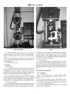 SIGNIFICANCE AND USE 5.1 Both test methods are considered satisfactory for acceptance testing of commercial shipments of garments with prong-ring type snap fasteners. 5.1.1 In case of dispute arising from differences in reported test results when using this test method for acceptance of commercial shipment, the purchaser and the supplier should conduct comparative tests to determine if there is a statistical bias between their laboratories. Competent statistical assistance is recommended for the investigation of bias. As a minimum, the two parties should take a group of test specimens that are as homogeneous as possible and that are from a lot of material of the type in question. The test specimens should then be randomly assigned in equal numbers to each laboratory for testing. The average results from the two laboratories should be compared using appropriate statistical analysis and an acceptable probability level chosen by the parties before testing is begun. If a bias is found, either the cause must be determined and corrected, or the purchaser and supplier must agree to interpret future test results with consideration to the known bias. 5.2 Comparison of results from test equipment operating on different principles is not recommended. In cases of conflict between the test results achieved with manual test equipment (Option 2) and motorized CRE (constant rate of extension) tensile testing machine (Option 1), the results from the motorized equipment shall take precedence. 5.3 This test method may be used to determine the compatibility of prong-ring type snap fasteners and fabrics for use in apparel. In which case, the fasteners are attached to the fabric in the manner in which they will be used and the combined units tested. See Annex A1. SCOPE 1.1 This test method covers the determination of the holding strength of a prong-ring to the socket or stud of a snap fastener using a tensile testing machine (Option 1) or a manual test stand and force-measuring gage (Option 2). 1.2 This test method is applicable to prong-ring type snap fasteners in garments or to be attached to fabrics intended for use in apparel (see Annex A1). 1.3 The values stated in either SI units or inch-pound units are to be regarded separately as standard. Within the text, the inch-pound units are shown in parentheses. The values stated in each system are not exact equivalents; therefore, each system shall be used independently of the other. Combining values from the two systems may result in non-conformance with the standard. 1.4 This standard does not purport to address all of the safety concerns, if any, associated with its use. It is the responsibility of the user of this standard to establish appropriate safety, health, and environmental practices and determine the applicability of regulatory limitations prior to use. 1.5 This international standard was developed in accordance with internationally recognized principles on standardization established in the Decision on Principles for the Development of International Standards, Guides and Recommendations issued by the World Trade Organization Technical Barriers to Trade (TBT) Committee.