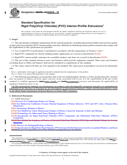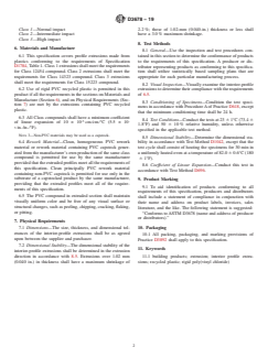 ABSTRACT This specification establishes requirements for the material properties, including dimensional stability and extrusion quality, of three classes of rigid, poly(vinyl chloride) (PVC) interior-profile extrusions. Methods for identifying interior-profile extrusions that comply with the requirements of this specification are provided. SCOPE 1.1 This specification establishes requirements for the material properties, including dimensional stability and extrusion quality, of rigid, poly(vinyl chloride) (PVC) interior-profile extrusions. Methods for identifying interior-profile extrusions that comply with the requirements of this specification are provided. 1.2 Use of rigid PVC recycled plastic is permitted in accordance with the requirements of Sections 6 and 7. 1.3 Rigid PVC compounds for interior building product applications are covered in Specification D1784. 1.4 Rigid PVC exterior profile extrusions for assembled windows and doors are covered in Specification D4726. 1.5 The text of this standard references notes and footnotes which provide explanatory material. These notes and footnotes (excluding those in Tables and Figures) shall not be considered as requirements of this standard. 1.6 The values stated in SI units are to be regarded as the standard. The values given in parentheses are given for information only. Note 1: Information with regard to application should be obtained from the manufacturers of the profiles. Note 2: There is no known ISO equivalent to this standard. 1.7 The following precautionary caveat pertains only to the test method portion, Section 8, of this specification: This standard does not purport to address all of the safety concerns, if any, associated with its use. It is the responsibility of the user of this standard to establish appropriate safety, health, and environmental practices and determine the applicability of regulatory limitations prior to use. 1.8 This international standard was developed in accordance with internationally recognized principles on standardization established in the Decision on Principles for the Development of International Standards, Guides and Recommendations issued by the World Trade Organization Technical Barriers to Trade (TBT) Committee.