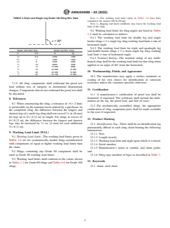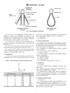 ABSTRACT This specification covers requirements and method of rating and testing for alloy chain slings. Only component parts compatible with alloy chain shall be used. Sling assembled by welding shall be fabricated by the electric or gas welding process, or both. The material shall undergo proof test to meet the prescribed mechanical requirements. Several grades of alloy chain sling shall conform to the specified working load limit values. SCOPE 1.1 This specification covers the requirements and method of rating and testing for alloy chain slings. Slings shall be assembled using components manufactured in accordance with Specification A391/A391M for Grade 80 chain, Specification A973/A973M for Grade 100 chain, and Specification A952/A952M for other components. This specification covers welded and mechanically assembled slings. 1.2 This specification does not cover slings used at elevated temperatures (above 400 °F [200 °C]), in harmful or corrosive environmental conditions or for applications such as nonsymmetrical legs or loading. 1.3 This specification is a performance and assembly specification. Other standards, such as OSHA 1910.184, ASME B30.9, and ASME B30.10, apply to the use of the products in this specification. 1.4 The values stated in either inch-pound units or SI units are to be regarded separately as standard. Within the text, the SI units are shown in brackets. The values stated in each system are not necessarily exact equivalents; therefore, to ensure conformance with the standard, each system shall be used independently of the other, and values from the two systems shall not be combined. 1.5 This international standard was developed in accordance with internationally recognized principles on standardization established in the Decision on Principles for the Development of International Standards, Guides and Recommendations issued by the World Trade Organization Technical Barriers to Trade (TBT) Committee.