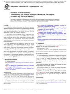 ASTM D6653/D6653M-13(2021) is a standard published by ASTM International. Its full title is "Standard Test Methods for Determining the Effects of High Altitude on Packaging Systems by Vacuum Method". This standard covers: SIGNIFICANCE AND USE 4.1 Packaged products transported by meansn of the feeder aircraft network are liable to experience altitudes as high as 5 791 m [19 000 ft].4 When exposed to these high altitude conditions, products or packaging systems, or a combination thereof, may be affected negatively by the resultant pressure differential. 4.2 These test methods are suitable for evaluating the effect of high altitude on packaging systems. 4.3 These test methods are suitable for package or product, or both, development and engineering. 4.4 Other test methods, such as Test Methods D3078, D4991 and D5094, test for leakage of packaging systems by vacuum method and are applicable for testing the effects of high altitude. SCOPE 1.1 These test methods determine the effects of pressure differential when packaged products are transported by meansn of certain modes of transport, such as feeder aircraft or ground over high mountain passes. The results of these tests are intended to be used for qualitative purposes. 1.2 The values stated in either SI units or inch-pound units are to be regarded separately as standard. The values stated in each system may not be exact equivalents; therefore, each system shall be used independently of the other. Combining values from the two systems may result in non-conformance with the standard. 1.3 This standard does not purport to address all of the safety concerns, if any, associated with its use. It is the responsibility of the user of this standard to establish appropriate safety, health, and environmental practices and determine the applicability of regulatory limitations prior to use. 1.4 This international standard was developed in accordance with internationally recognized principles on standardization established in the Decision on Principles for the Development of International Standards, Guides and Recommendations issued by the World Trade Organization Technical Barriers to Trade (TBT) Committee.